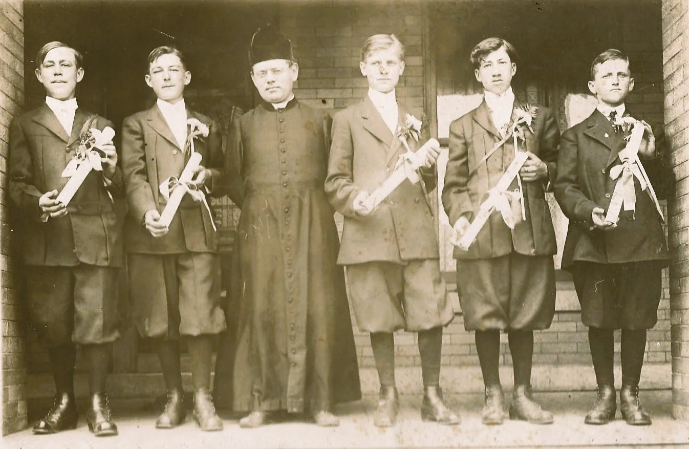 Rev. Benedict Rajcany is flanked by five graduates of St. John the Baptist School in 1915 or 1916.
