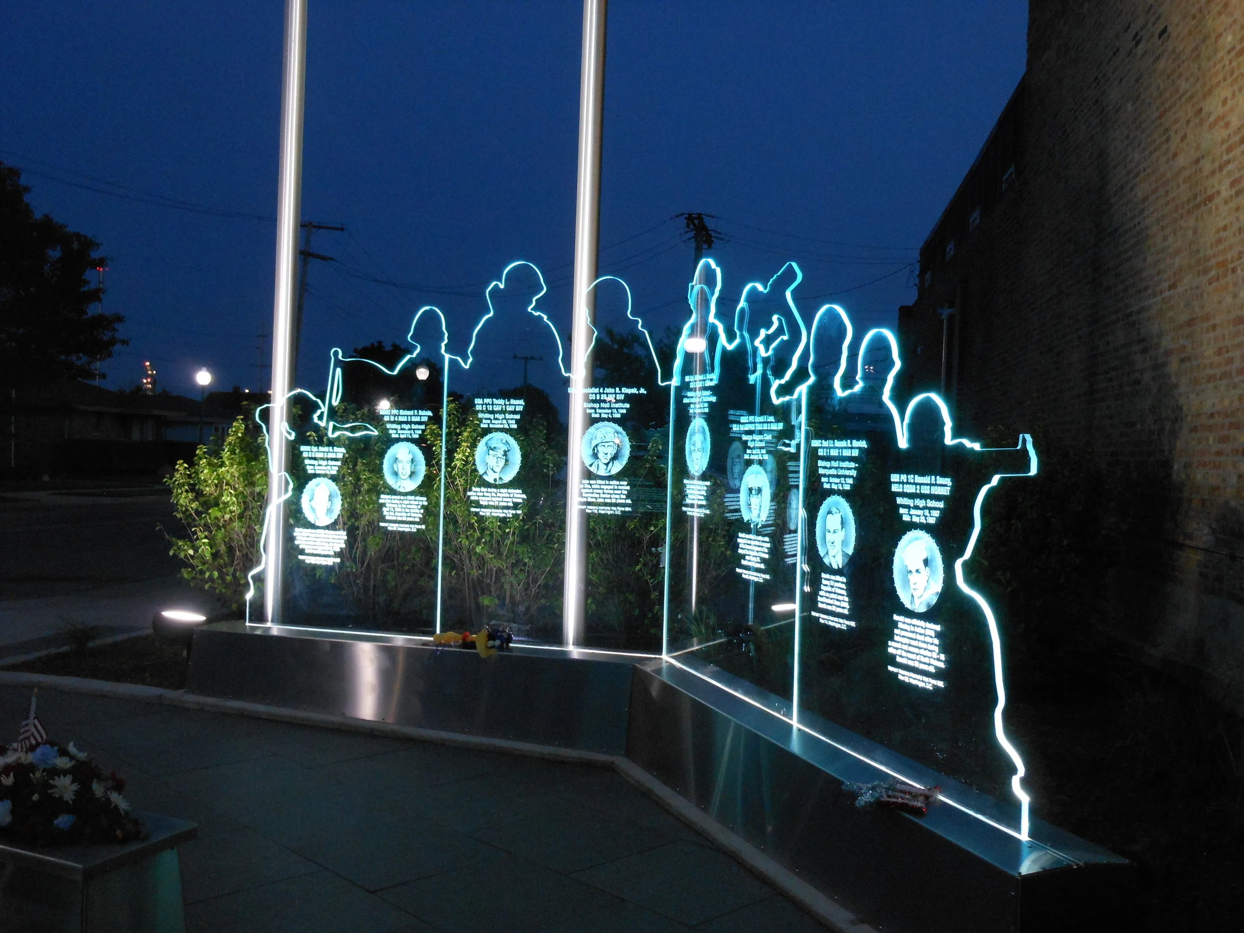 The memorial is at the southwest corner of Schrage Avenue and 119th Street, the site of the former Standard Hotel. The original memorial was dedicated on October 24, 1998, but needed to be replaced after years of wear.